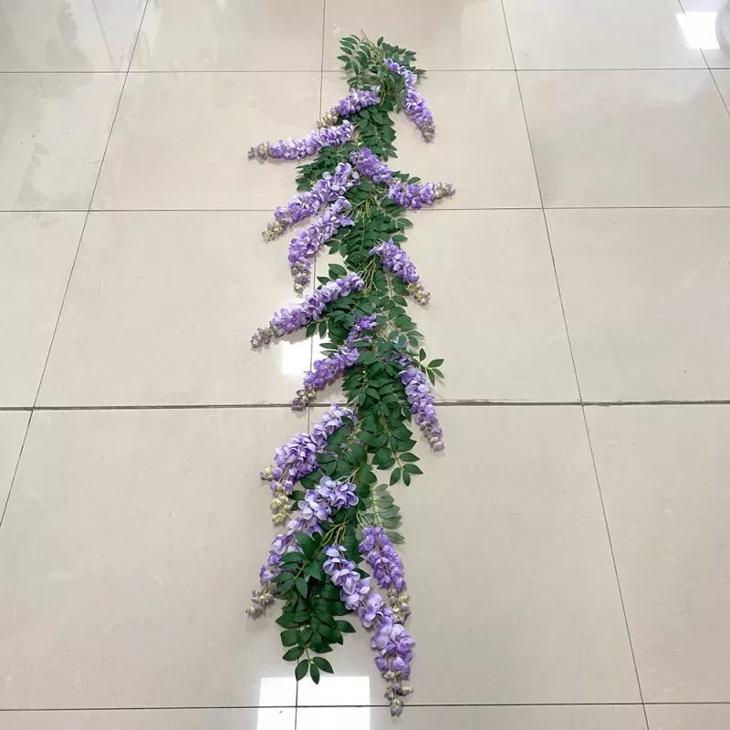 இந்த 2 மீட்டர் நீளமுள்ள போலி விஸ்டேரியா கொடியின் உயர்தர பட்டு, பிளாஸ்டிக் மற்றும் இரும்பு கம்பி ஆகியவற்றால் ஆனது. ஒவ்வொரு கிளையிலும் 17 வைடெரியா மலர் சரங்கள் மற்றும் 40-50 பச்சை இலைகள் உள்ளன. இது ஒரு இயற்கை துணியைக் கொண்டுள்ளது. பூக்கள் மற்றும் இலைகளின் அடர்த்தி இரண்டும் மிகவும் நல்லது. திருமண வளைவு அலங்காரம், உச்சவரம்பு இயற்கையை ரசித்தல், செயற்கை மலர் பின்னணி சுவர் அல்லது வணிக இடத்தைத் தொங்கும் ஏற்பாடு ஆகியவற்றிற்கு இது மிகவும் பொருத்தமானது.
